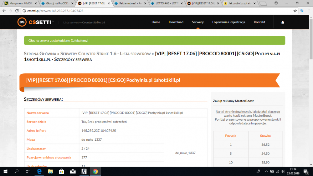 SmO.oCzY Napisano 22 Czerwca 2019 #528218 Zgłoś Udostępnij Napisano 22 Czerwca 2019 Dnia 12.04.2015 o 12:30, Ana napisał: Witam. Zachęcam wszystkich do oddawania głosów na serwer ProCOD. Dzięki tym kliknięciom serwer będzie wyżej na liście;) Dla was to 5 sekund dla serwera dużo. Każdy, komu zależy na tym, by ten serwer był jednym z najlepszych proszę pomoc;) http://cssetti.pl/serwer/145.239.237.104:27425 Także możecie pomóc całej naszej sieci serwerów głosując na wszystkie nasze serwery. GŁOSOWAĆ MOŻNA RAZ NA 24 GODZINY!!! Przepraszam was za niedziałający link. Oto prawidłowy: http://cssetti.pl/serwer/79.133.192.56:27015 Cytat wielokrotny Cytuj Zgłoś @ Udostępnij Odnośnik do komentarza Udostępnij na innych stronach More sharing options...